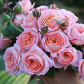 Wutong Yue “Sycamore Moon” is a medium-sized shrub rose with a plant height of 60-90cm, each bloom measures between 6-8cm in diameter, making it suitable for small spaces, like balcony or just in pots. The flowers have a blend of salmon pink and apricot yellow colors, with a moderate fruity fragrance. In warmer temperatures, the blooms lean more towards salmon pink, while in cooler conditions, the center develops an apricot yellow hue, creating a soft and delicate appearance.